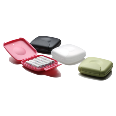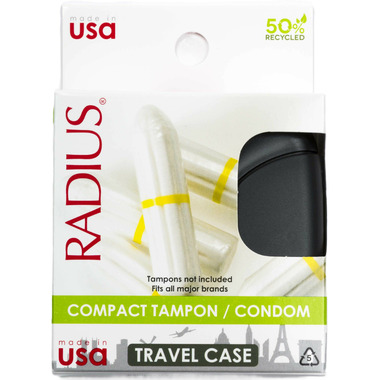 Radius Small Tampon/Condom Case utilizes patented “living hinge” technology for streamlined opening and has a snap lock for secure closure.