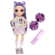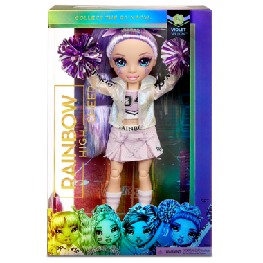 Collect the Rainbow of school spirit with Rainbow High Cheer fashion dolls. Violet Willow got a cheerleading makeover in a gorgeous purple cheer outfit that reflects her glam, diva style. She has gorgeous features, long eyelashes and beautiful, brushable hair in a ponytail. Her hair also features a cheerleader bow and barrette. She's fully articulated and posable. Her arms and legs bend, so she can strike tons of glamorous cheer poses. Violet also comes with pom poms, so she can cheer on Rainbow High in style. Also includes hair comb. Collect all 6 Cheer fashion dolls - Ruby Anderson, Poppy Rowan, Sunny Madison, Jade Hunter, Skyler Bradshaw & Violet Willow