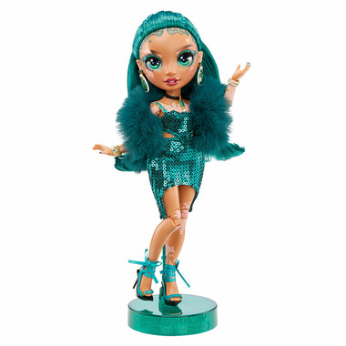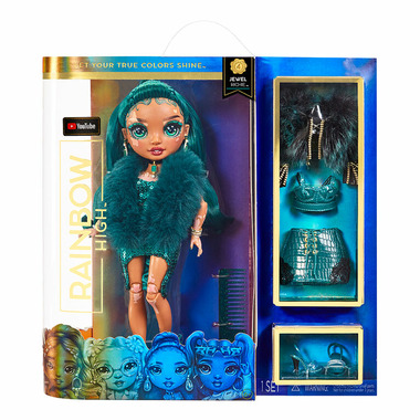 - GORGEOUS FEATURES: Jewel Richie has a unique design and our first doll with Vitiligo. She is dressed in EMERALD GREEN from head to toe. She has gorgeous detailed features in her fashion, beautiful straight hair with hair rings, long eye lashes and glass eyes. Collect the Rainbow of all the gorgeous Rainbow High fashion dolls.