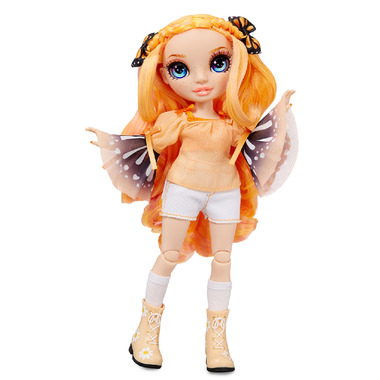Rainbow High inspires creativity! Go back in time and meet your favorite students before they became friends and followed their creative dreams to Rainbow High. Each themed playset comes with a complete doll outfit, doll with new younger face-sculpts, and a soft fabric backpack to carry their school essentials. This playset will give kids endless joy and imaginative storytelling entertainment. They have gorgeous features! Poppy Rowan is dressed in her signature ORANGE from head to toe. She has a gorgeous younger face sculpt, detailed features in her fashion, beautiful long curled orange hair, long eye lashes and glass eyes. Collect the Rainbow of all the gorgeous Jr High fashion dolls. They come with their Jr. High Fashions. Poppy is a west coast girl and loves the sunshine. Her favorite thing to do is walk through town, while listening to the sounds and getting inspired. She comes wearing an adorable butterfly top with ruffle sleeves and ribbon tie, white twill shorts with a hook closure, floral combat boots that lace up, and her school essential accessories. Poppy has been creative at a young age. Music production runs in her family, and she plans on following those footsteps. No surprise, she customized her own backpack. She comes with a soft fabric backpack that opens and closes with a butterfly patch and Rainbow tag. Perfect accessory to store her butterfly hair clips. You can also pose younger and older Poppy together as a perfect duo. She's 9 inches tall and fully articulated and posable, her arms and legs bend for so many glamourous poses. Or you can display her with her older version for a perfect collector combo. The doll playset comes with: Fashion doll, a complete doll outfit, a pairs of doll shoes, a pair of socks, and doll accessories- soft fabric backpack that opens and closes, a pair of butterfly hair clips, and doll comb. Watch the Animated Series on YouTube and Netflix! Just search for "Rainbow High Dolls." Here is a Pro tip, wash hair to remove styling gel.