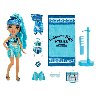 Rainbow High inspires creativity. Meet the students of Pacific Coast High, the most elite fine arts school on the west coast. Here the days are sunny and the classes are poolside. Each themed playset comes with complete doll outfit, signature must-have poolside accessories, and a bonus feature, interchangeable legs. Hali Capri has gorgeous features is dressed in Capri (blue) from head to toe. She has gorgeous, detailed features in her fashion, beautiful long BLUE CURLED hair IN A STYLISH PONY TAIL, long eye lashes and glass eyes. Collect the Rainbow of all the gorgeous Rainbow High fashion dolls.  There is a bonus features with a pair of interchangeable legs that snap at the knees and can slip from sandals to heels instantly. Now Hali is ready for any occasion. A walk alongside the sandy coast to a smoothie at the bar. (High Heel Shoes not included, but all Rainbow High Fashion Doll High Heel Shoe will fit). Hali is the ultimate California girl so designing swimsuits and resort wear is a “walk on the beach” for her. She comes wearing a printed two-piece swimsuit with a molded Rainbow High buckle, removable shorts with double sided twill and mesh design, strappy sandals with gold charms, along with all the essential pool gear. Hali is a west coast girl and is always ready for fun under the sun! Playset comes with coordinating beach terry cloth towel, tote with gold chain details, satin wrap visor, and sunglasses for imaginative storytelling play. Pose her on doll stand. She's fully articulated and posable, her arms and legs bend for so many glamourous poses for you can display her on the included doll stand. Complete with Fashion doll, complete doll outfit, interchangeable legs, pair of doll shoes, and doll accessories - tote handbag, doll comb, sunglasses, towel, hat, and a doll stand.