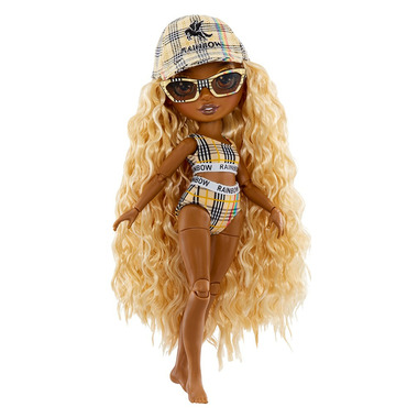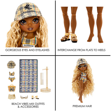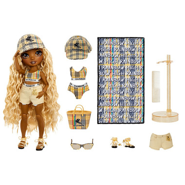 Rainbow High inspires creativity. Meet the students of Pacific Coast High, the most elite fine arts school on the west coast. Here the days are sunny and the classes are poolside. Each themed playset comes with complete doll outfit, signature must-have poolside accessories, and a bonus feature, interchangeable legs. Harper Dune has gorgeous features and is dressed in sandy plaid (light yellow) from head to toe. She has gorgeous, detailed features in her fashion, beautiful long wavy BLONDE hair, long eye lashes and glass eyes. Collect the Rainbow of all the gorgeous Rainbow High fashion dolls. There is a bonus features with a pair of interchangeable legs that snap at the knees and can slip from sandals to heels instantly. Now Harper is ready for any occasion. A walk alongside the sandy coast to a smoothie at the bar. (High Heel Shoes not included, but all Rainbow High Fashion Doll High Heel Shoe will fit). Harper is a triple threat: singer, dancer, actress, so it’s no surprise that she loves to be in the spotlight; so her fashion is always spot on, even by the pool. She comes wearing a matching plaid swimsuit, removable shorts with twill white percale pockets and molded RH keychain belt charm , and strappy sandals with gold beads, along with all the essential pool gear. Harper is a west coast girl and is always ready for fun under the sun! Playset comes with coordinating beach terry cloth towel, embroidered beach hat, tote handbag and sunglasses for imaginative storytelling play. Pose her on doll stand. She's fully articulated and posable, her arms and legs bend for so many glamourous poses for you can display her on the included doll stand. Complete with Fashion doll, complete doll outfit, interchangeable legs, pair of doll shoes, and doll accessories - tote handbag, doll comb, sunglasses, towel, hat, and a doll stand. Watch the Animated Series on YouTube & Netflix! Just search for "Rainbow High Dolls." Here's a pro-tip to remove the styling gel. When first unboxing doll, wash her hair thoroughly to remove styling gel and let hair dry completely. Then, her hair is ready to brush. Complete the Pacific Coast High Collection by collecting all 7 Pacific Coast Dolls and matching Pacific Coast Color Change Pool and Beach Playset: Finn Rosado, Bella Parker, Simone Summers, Harper Dune, Hali Capri, Margot De Perla, Phaedra Westward. Visit the Rainbow High Store to shop the amazing collections. #LETYOURTRUECOLORSSHINE. All fashion dolls sold separately.