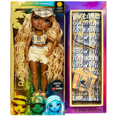 - GORGEOUS FEATURES: Harper Dune is dressed in sandy plaid (light yellow) from head to toe. She has gorgeous, detailed features in her fashion, beautiful long wavy BLONDE hair, long eye lashes and glass eyes. Collect the Rainbow of all the gorgeous Rainbow High fashion dolls.