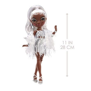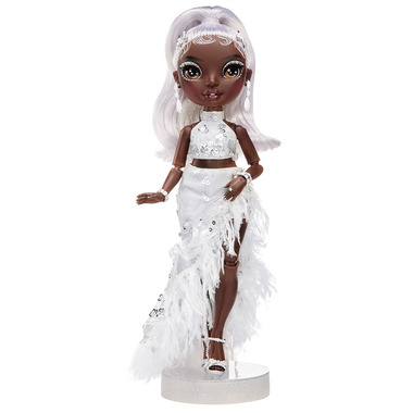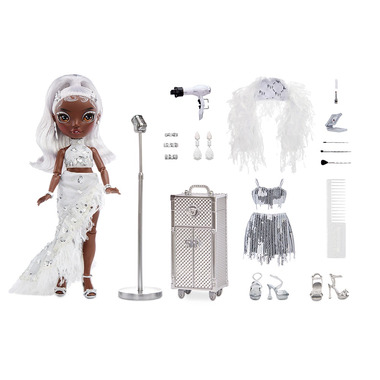 • GORGEOUS FEATURES: Ayesha Sterling has a unique design and is dressed in silver and white tones from head to toe. She has gorgeous, detailed features in her fashion, beautiful curled silver hair, long real eye lashes and glass eyes. Collect the Rainbow of all the Rainbow Vision- Rainbow Divas fashion dolls.