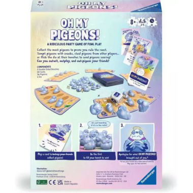 In this ridiculous party game of fowl play, be the first to fill your bench with pigeons. Play hilariously illustrated cards allow you to collect pigeons from the middle of the table or even steal them from your neighbors benches. When you roll the die, you might get to flick it at an opponents pigeons to knock them off their bench!