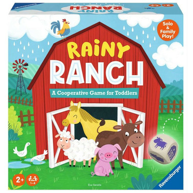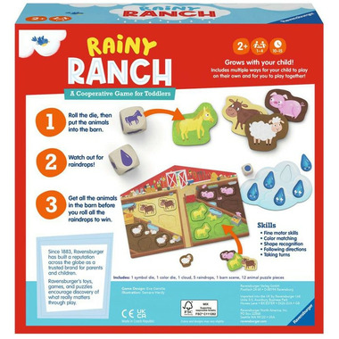 A Cooperative Game for Toddlers Your toddler will build fine motor skills, colour matching, shape recognition, direction following, and turn taking with Rainy Ranch! Roll the die to lead animals into the barn, watch out for raindrops, and get everyone safely inside before it rains. Ravensburger preschool games grow with your child! Rainy Ranch includes multiple ways for your child to play on their own and for you to play together. Since 1883, Ravensburger has built a reputation across the globe as a trusted brand for parents and children. Ravensburger's toys, games, and puzzles encourage discovery of what really matters through play.