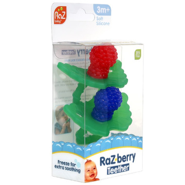 RaZbaby RaZberry Silicone Teether Toy is a stimulating, multi-textured pacifier used to soothe swollen gums and emerging teeth. Perfect texture to chew. This hands-free all silicone teething pacifier can also be frozen for extra comfort. Simply place water in the Teether and freeze. In minutes you have the best cooling teething toy to soothe you newborns tender gums. RaZberry Teether is Non-toxic food grade silicone and is free of BPA, PVC, phthalates, lead and cadmium. All natural and environmentally friendly. Multi Texture Teething surfaces encourage baby teething and grabbing. The ring is texture for a full 360 degrees of teething relief. Conforms to USA Consumer Product Safety Commission requirements. Conforms to EU standards