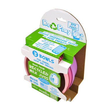 Re-Play Bowls are made in the USA, from recycled milk jugs. With funky bright colours and chunky shapes, Re-Play tableware is toddler tuff! Bowls come in a pack of 3 and are perfectly proportioned for your toddler. Finally a bowl that is sized just right…big enough for a child’s meal portion, but small enough for snack times, too.