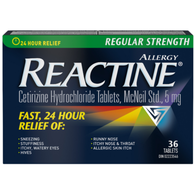 Reactine Regular Strength Antihistamine Tablets provide fast, long-lasting relief from indoor and outdoor allergy symptoms. Each dose contains 5 milligrams of cetirizine hydrochloride for allergy relief that that provides fast relief and lasts 24 hours. Fast, 24 hour relief of sneezing; stuffiness; itchy, watery eyes; hives; runny nose; itchy nose and throat; nasal congestion; and allergic skin reactions.