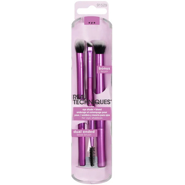 Create stunning professional-style results with your makeup when you use the Real Techniques Eye Shade + Blend Makeup Brush Trio. These ultra-plush makeup brushes make it easier than ever to get the perfect selfie-ready application out of your favorite eye shadow products. They're designed for easy two-color shadow application while their individual extreme taper shapes allow for buildable all-over lid application and effortless crease blending. The brushes are long lasting, easy to clean, and ensure a flawless finish every time. Even under bright lights, the quality of makeup applied using the Real Techniques Eye Shade and Blend Makeup Brush Duo will be pixel perfect. Bonus dual ended brow brush included to finish your look with great brows!
