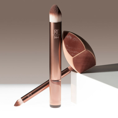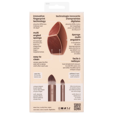 The Real Techniques Makeupsaver Sponge + Brush Trio features the Makeupsaver Sponge and two makeup brushes that mirror the shape of your fingertip for precise application with a natural-looking finish.