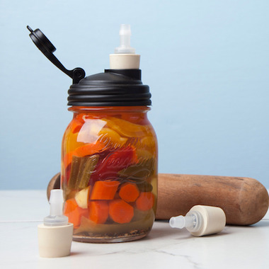 Utilizing the original reCAP POUR Mason jar lids, the Fermenter creates an air-tight seal with the one-way waterless airlock valve and stopper.  During the ferment, the carbon dioxide releases through the waterless airlock valve as pressure builds up within the Mason jar.  When the fermentation is done, simply remove the Fermenter and the reCAP POUR Mason jar lid turns into a Mason jar storage cap.  The reCAP Fermenter is the most multi-functional fermenter available!