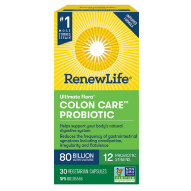 New Improved Formula Renew Life Ultimate Flora Colon Care Probiotic has 80 billlion live cultures from 12 probiotic strains to support your colon health. This probiotic reduces the frequency gastrointestinal symptoms including constipation, irregularity and flatulence.
