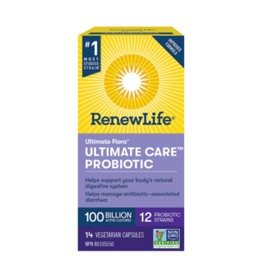 Renew Life® Ultimate Flora® Ultimate Care™ Probiotic is a high CFU probiotic to help support digestive health and help manage antibiotic-associated diarrhea with 100 billion live cultures from 12 probiotic strains.