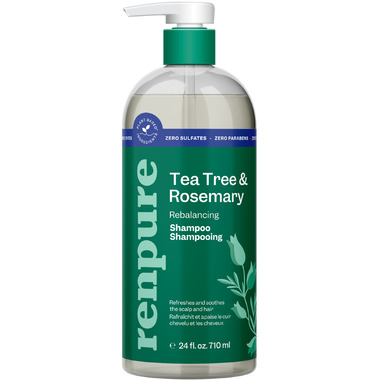Renpure Tea Tree & Rosemary Refresh and Rebalance Plant-Based Shampoo is infused with Tea Tree Leaf Oil and Rosemary Leaf Extract; this plant-based shampoo hydrates and soothes the scalp while leaving hair smooth, frizz-free, and shiny.