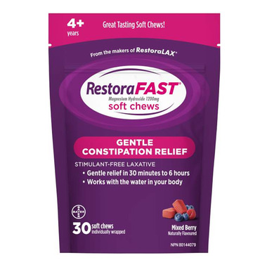Get fast and gentle relief with RestoraFAST Soft Chews! RestoraFAST is brought to you by the makers of RestoraLAX and is a fast-acting laxative that you can trust to be gentle. Made with magnesium hydroxide, these tasty soft chews work naturally with the water in your body to provide fast constipation relief in as little as 30 minutes to 6 hours. Free from stimulants, RestoraFAST Soft Chews is a perfect laxative solution to provide reliable constipation relief for adults and kids ages 4+. Whether at home or on the go, RestoraFAST offers a convenient and effective way to relieve constipation.