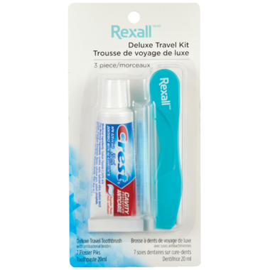 Includes: Travel toothbrush, 7 Flosser piks, 20mL Toothpaste