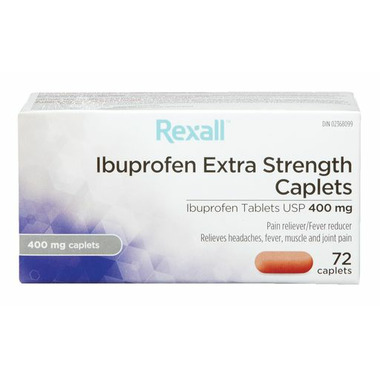 Rexall Extra Strength Ibuprofen is a pain reliever with 400 mg ibuprofen per caplet.