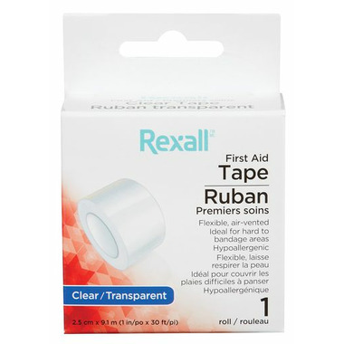 The Rexall First Aid Clear Tape is ideal for dressings areas that are hard to bandage or need to be checked often. It is flexible, air-vented and hypoallergenic.