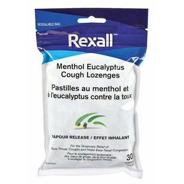 Rexall Lozenges Menthol Eucalyptus, for the temporary relief of sore throats,coughs and nasal congestion.