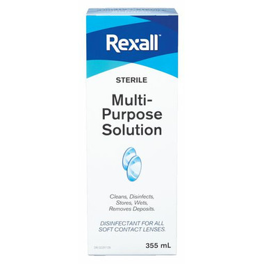 Rexall Multi-Purpose Solution, for all soft contact lenses. Cleans, disinfects and removes deposits. Storage case included.
