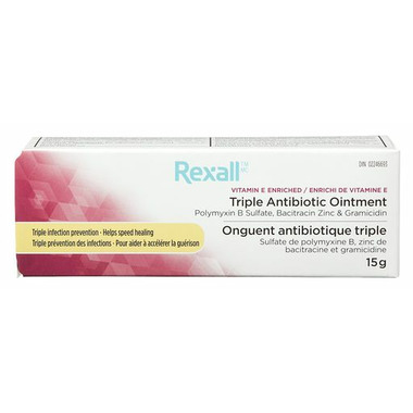 Rexall Triple Antibiotic Ointment is enriched with the skin conditioning agent Vitamin E. It helps prevent infection and helps aid healing in minor cuts, scrapes and burns.