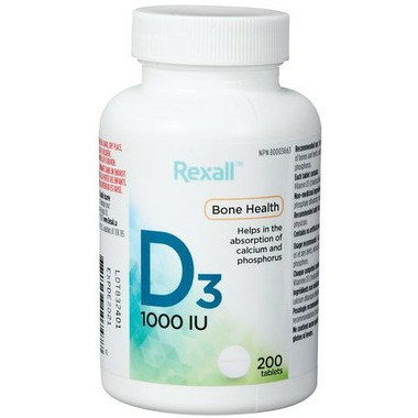 The Rexall Vitamin D3 Tablets help in the absorption of calcium and phosphorus for overall bone health.