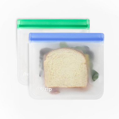 Imagine a world where packed lunches stay gorgeous, and everyone stops throwing out plastic bags. (re)zip flat lunch bags are here for that. They're the original leakproof reusable storage bag whose stellar design and performance made them #1 in a Cook's Illustrated test. They're better than disposables because they're made of sturdy, lightweight, and food-safe PEVA, which holds up through hundreds of uses in the kitchen and beyond. This 2 piece kit includes 2 (re)zip sandwich size bags. Use them to replace plastic baggies used for snacks, sandwiches, travel, home organization and more. What fits inside One fully loaded sandwich 2 grilled chicken breasts 2 cups frozen fruit 3 cups packed kale Phone, wallet, and keys Sunglasses, lip balm, sunscreen, aloe spritz An honest serving of potato chips with a puff of air to protect them Travel-size bath kit Gym kit: headphones, protein bar, washcloth Baby gear essentials du jour Crinkle-free movie treats Nearly enough pet snacks A jumbo chocolate chip cookie Some toys