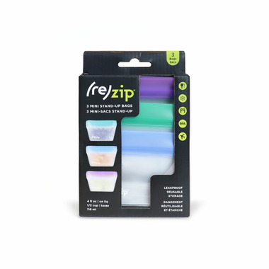 Small yet mighty, with a wide base and a tidy profile, the Mini Stand-up is the perfect reusable storage bag for a snack portion of granola, post-workout egg bites, or even that extra half-onion from last nights stir fry. If you're like most people, your bags will start out organizing kitchen ingredients, and snacks, but soon will be indispensable for little jobs in the playroom, art cabinet, desk drawer, and purse, keeping all your tiny valuables neat and organized. Once you use a (re)zip you'll feel the quality from the smooth, sturdy material, and well-designed construction to that satisfying little click when you seal it. They are made from 100% food-safe PEVA so they are leak-proof and airtight, keeping contents in, and your bag safe and dry.