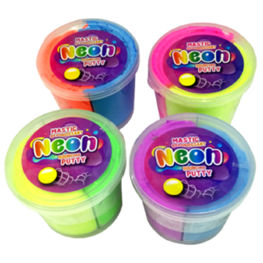 Neon bouncing putty, 2 colours per cup, possibility to extend, stretch and shape it.
