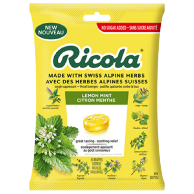 Get soothing relief for sore throats with the fresh lemony taste of Ricola Lemon Mint. No Sugar Added. It combines natural lemon balm extract with menthol sourced from real peppermint leaves. Plus Ricola’s unique blend of mountain grown Swiss herbs. Ricola Lemon Mint is a refreshing answer to most any throat irritation.