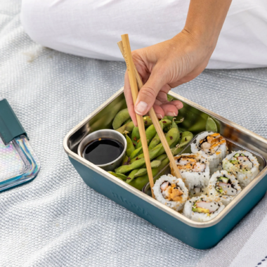 This patented & premium inserts are completely non-toxic, crystal-clear Tritan and topped with leakproof silicone lids for a seamless fit into the 9"x6" Bento Box.