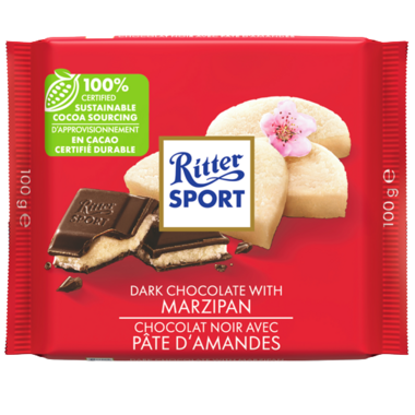 Ritter Sport Dark Chocolate Marzipan Square is 100% certified sustainable cocoa sourcing.