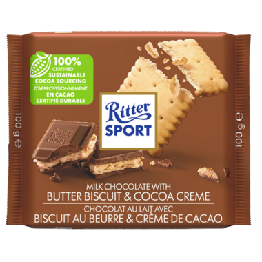 Ritter Sport Milk Chocolate Butter Biscuit & Cocoa Creme Square is 100% certified sustainable cocoa sourcing.