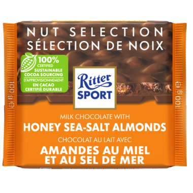 Ritter Sport Milk Chocolate with Honey Sea Salt Almonds Square - Nut Selection is 100% certified sustainable cocoa sourcing.