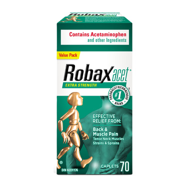 For effective relief of pain associated with muscle spasm such as back pain, tense neck muscles, strains and sprains. Robaxacet Extra Strength contains an analgesic (acetaminophen) to relieve pain and a muscle relaxant (methocarbamol) to relax tense muscles.