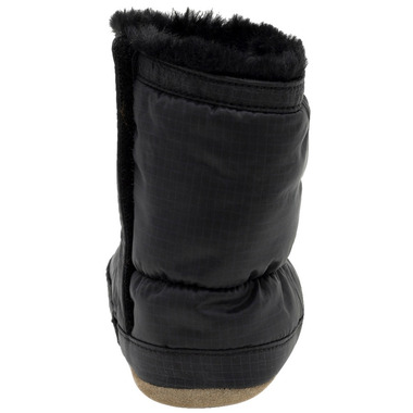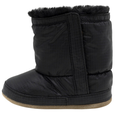 TheyA classic winter boot for infants and toddlers, the Asheville Boots in Black are made from black nylon lined with cozy, faux fur that keeps baby feet warm and comfortable through cold, windy winters. The cinched elastic band at the ankle prevents little ones from kicking or pulling off their boots without constricting their feet. Plus, the non-slip suede/split rubber soles help prevent slips and falls.