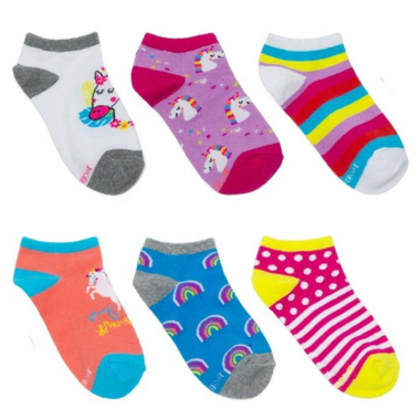 6pk pink unicorn and rainbow pattern no shows. All socks have knitted logo on the bottom and comfort toe seam.