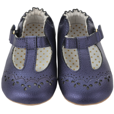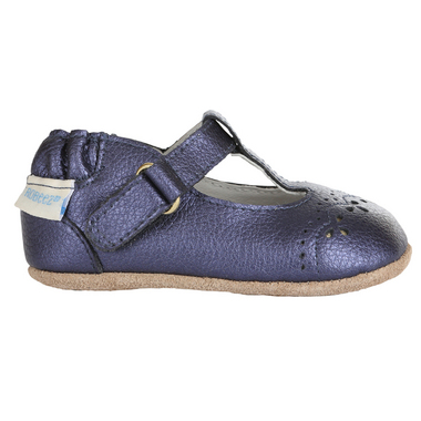 Your daughter will feel like a little lady in this shimmering navy leather t-strap baby shoe decorated with perforated cut outs on the toe. An adjustable hook and loop closure and an elasticized ankle make this shoe easy to put on and take off and ensure optimal fit.