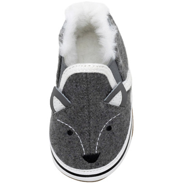 Inspired by a winter fox, the Baby Fox Soft Soles in Charcoal are cozy baby slip-ons made from a grey wool upper with a plush faux fur lining to keep your little one warm in the chillier months. Complete with pop-up fox ears, an embroidered fox face, and non-constricting suede soles, these winter baby shoes provide comfort, support, and traction to infants and pre-walkers as they learn to crawl, balance, and walk.
