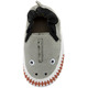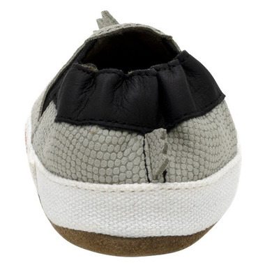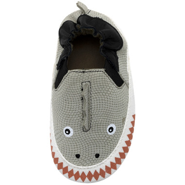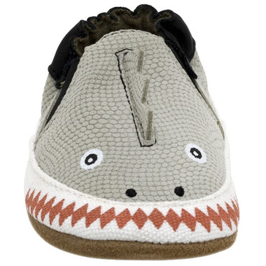 Everybody run! Here comes Robeez' Dino Dan Soft Soles! These grey PU, twill and leather baby shoes are designed to look like a dinosaur with screen printed eyes, nostrils and teeth and 3D head and tail fins.