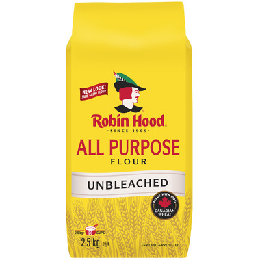Robin Hood since 1909 unbleached All Purpose Flour made with 100% Canadian Wheat.