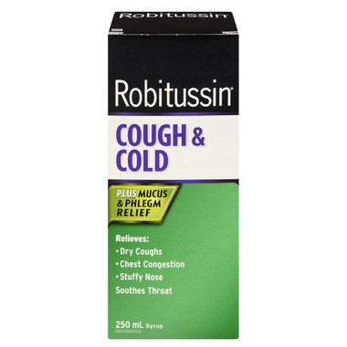 Robitussin Cough & Cold helps to relieve dry cough, chest congestion, stuffy nose, and sore throat. This syrup includes both a cough suppressant to quiet coughs and an expectorant to loosen mucus and phlegm, plus a decongestant to relieve congestion.