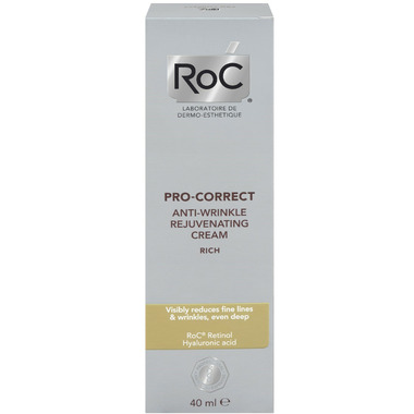 Moisturize and fight the signs of aging with RoC Pro-Correct Anti-Wrinkle Rejuvenating Cream. Suitable for all skin types, this hydrating anti-wrinkle cream is clinically shown to visibly reduce fine lines and wrinkles and make skin's texture look finer and brighter. After eight weeks, even the appearance of deep wrinkles is reduced.* With continuous use, your skin is smoother, softer, and plumper. RoC Pro-Correct Anti-Wrinkle Rejuvenating Cream has a rich texture that penetrates quickly and contains retinol and hyaluronic acid, which have been shown to be effective in helping reduce the visible signs of collagen and elastin loss and fight against the appearance of wrinkles. Apply daily, morning or evening, on face and neck, either alone, as a base for make-up, or in conjunction with another RoC® facial skincare product for a personalized anti-aging daily regimen.