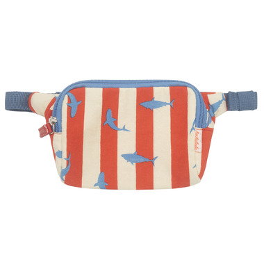 Dive deep into adventure with Rockahula's bright and bold shark bum bag! In Rockahula's stripy red fabric with circling sharks! This bum bag has an adjustable webbing waist strap, is fully lined in blue check fabric and has a zip closure. A fin-tastic place to keep Rockahula's treasures safe during any summer adventures!