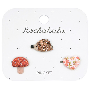 Perfect for nature lovers, this sweet set of three rings include a Hattie hedgehog, a floral heart and a glittery toadstool. Each ring is also adjustable for little fingers. Matching necklace, bracelet set, wand, hair clips and ponies also available. Made using recycled glitter and felt. Not suitable for children under 36 months due to small parts.