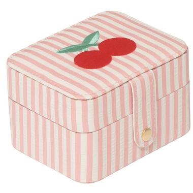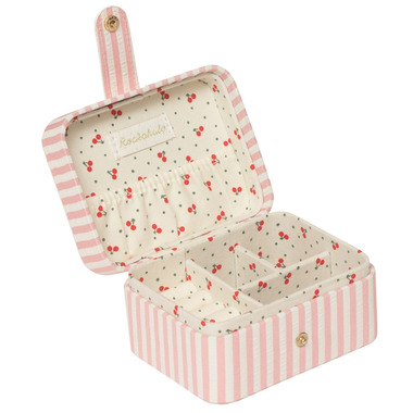 This sweet and stripy jewellery box is the perfect place to keep all your jewellery and favourite treasures safe! Featuring a delicious embroidered cherry, this jewellery box has a popper fastening and opens to reveal Rockahula's compartments, a slip pocket and a dedicated space to slot earrings and rings. Lined with Rockahula's sweet cherry print fabric.