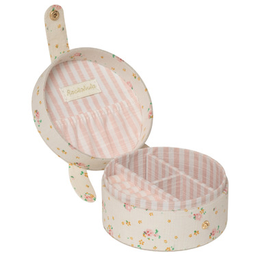 This cute bunny jewellery box is the perfect place to keep all your jewellery and favourite treasures safe! Featuring a gold embroidered bunny face, two floppy ears and made in Rockahula's beautiful tiny blossom fabric, it opens to reveal three compartments, a slip pocket and a dedicated space to slot earrings and rings. Lined with sweet stripy fabric.