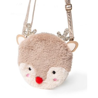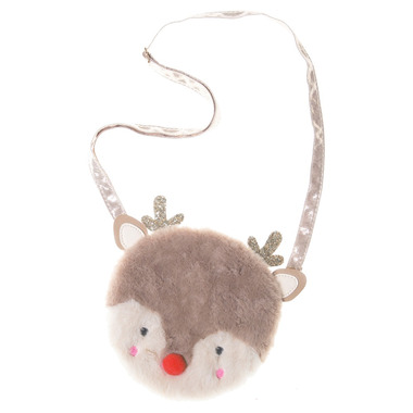 This cozy little reindeer bag is perfect for stashing all manner of Christmas treats! Made from the softest brown fur, with sparkly gold antlers and a cherry red pom pom nose. Fully lined in gold star fabric, this furry bag features a magnetic dot closure and a gold strap with a break point for safety.