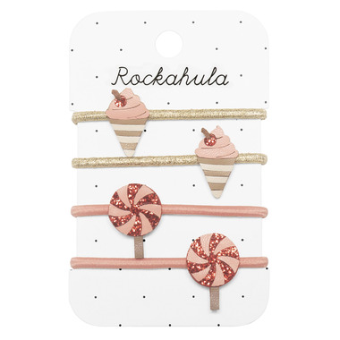 Help yourself to a scoop of Rockahula's delicious Very Cherry Ice Cream Ponies this summer! Two cherry topped swirled ice cream cones sit upon two gold elastics, whilst two glitter swirled lollies set upon two pink elastics.